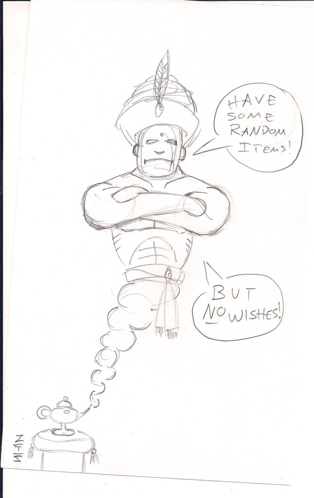 genie no wishes Published November 24, 2015 at 1210 × 1920 in King’s Quest II Doodles Seriously, this thing gives you a carpet, sword, and bridle, but doesn’t let you wish for anything?!? Lame.