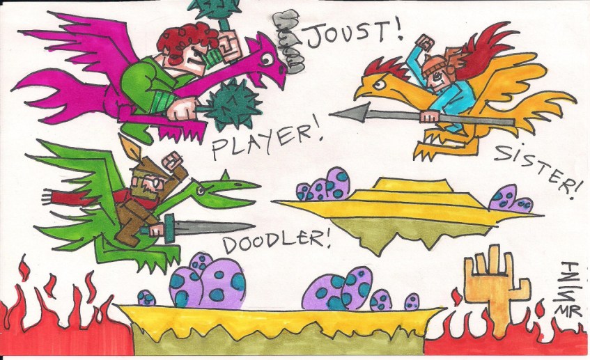 tumblr_nmpqjehltf1uo33e3o1_1280 Published December 2, 2015 at 1280 × 781 in Joust for the Atari 800 Three way Jousting! The Player, Doodler, and guest star The Sister medieval it up on flying birds.