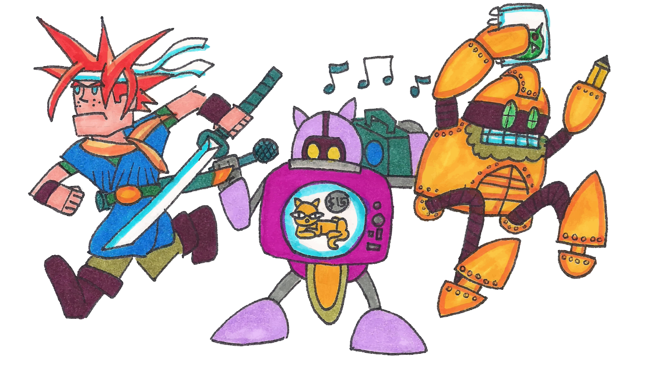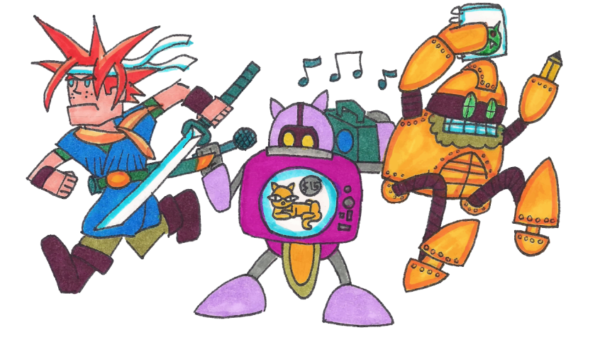 tumblr_nnl7jlbyej1uo33e3o1_1280 Published November 30, 2015 at 1280 × 720 in Chrono Trigger Doodles The drawing that eventually turned into our Chrono Trigger series intro. Featuring the Player as Crono, the Doodler as Robo, and Gato as some sort of washing machine dispensing cats and Silver Points!