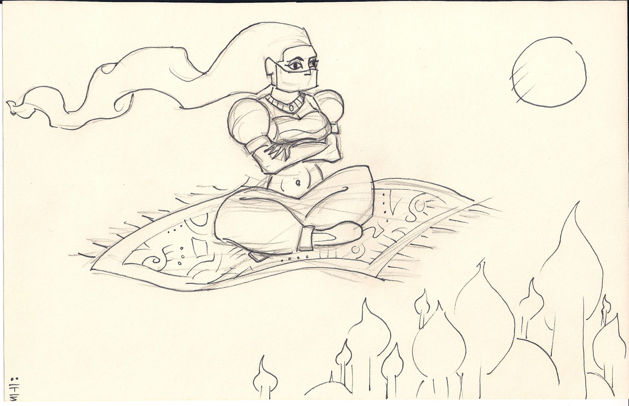 tumblr_nwolvheujp1uo33e3o1_1280 Published November 30, 2015 at 1280 × 827 in Quest for Glory II Doodles A sketch of Zayishah from Quest for Glory II, heading back to Shapeir on a flying carpet.