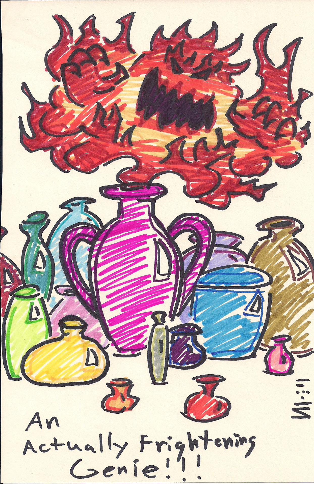 tumblr_nshfxlbq4g1uo33e3o1_1280 Published November 30, 2015 at 1244 × 1920 in King’s Quest VI Doodles Inspired by the completely un-frightening genie from King’s Quest VI who can’t seem to kill anyone. Not because he’s not allowed to, but because he’s kind of lazy. Also he’s not made of fire like this guy.