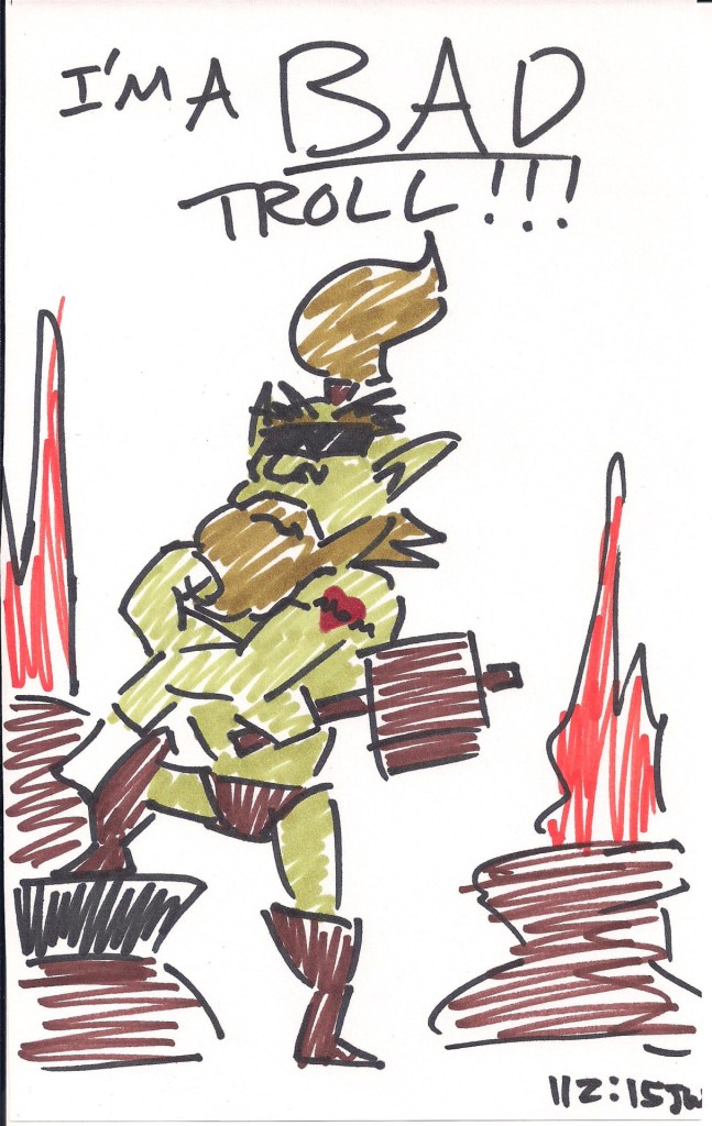 tumblr_nzoad9bt5z1uo33e3o1_1280 Published April 5, 2016 at 1213 × 1920 in King’s Quest VII Doodles Aww yeah, the baddest of the bad trolls! Inspired by the (decidedly less awesome) troll blacksmith from the game.