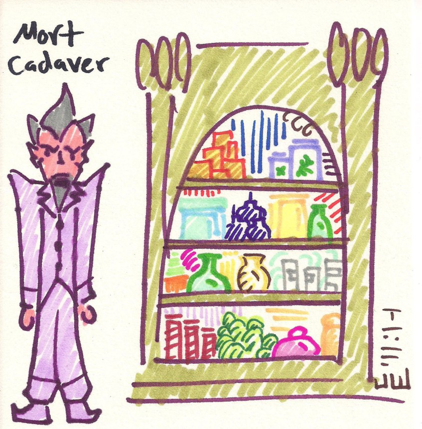 tumblr_o7a7b6qvjw1uo33e3o1_1280 Published July 8, 2016 at 1280 × 1301 in King’s Quest VII Doodles Dr. Mort Cadaver is lookin’ good with his new spine. Now he can reach the top shelf of his cabinet of mysterious ingredients!