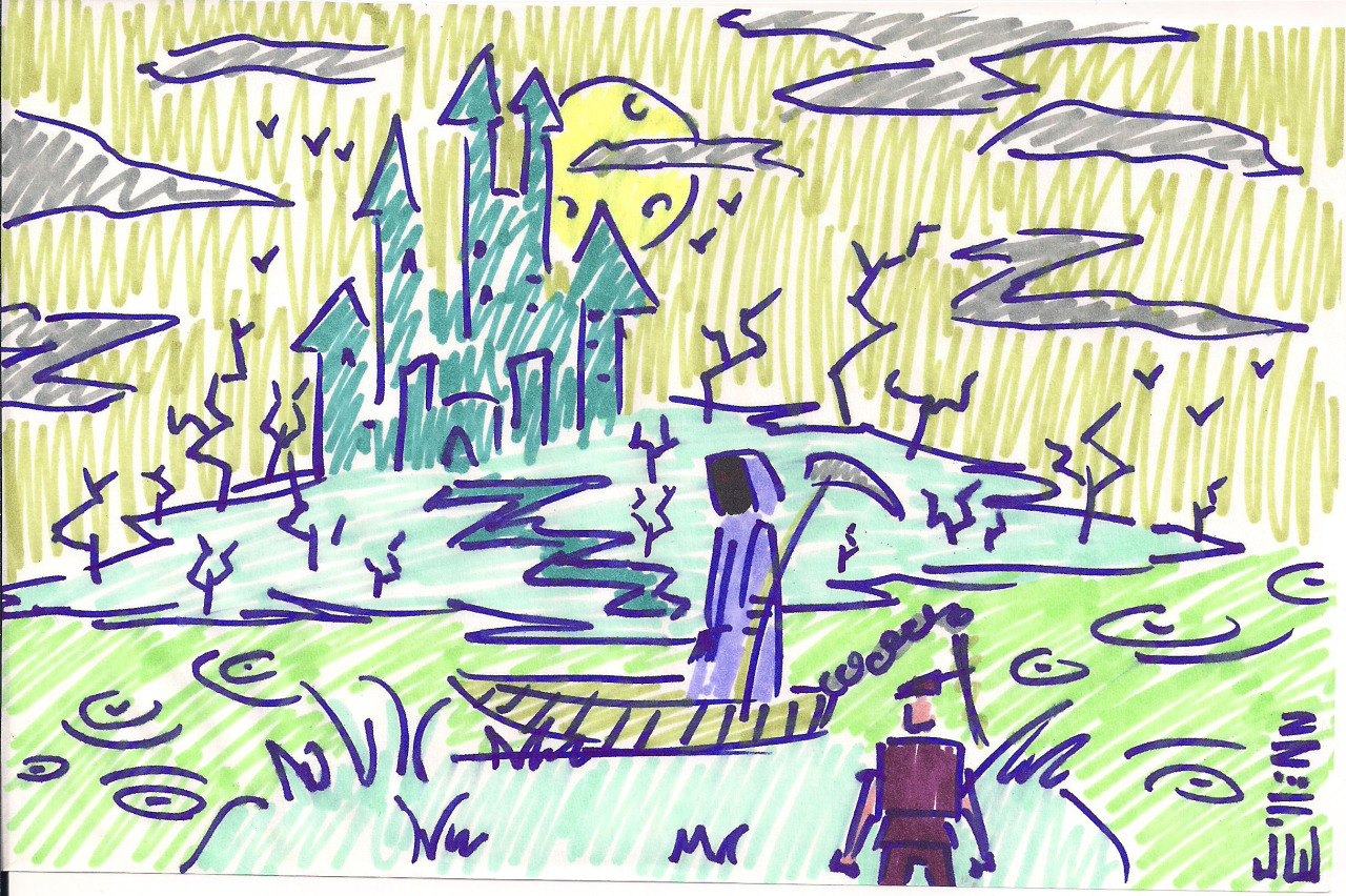 tumblr_o7a6y1pzen1uo33e3o1_1280 Published June 19, 2016 at 1280 × 852 in King’s Quest II VGA Doodles King Graham approaches the spooky non-square castle. Why, yes, Death, I’d be glad to get in a rickety boat with you!
