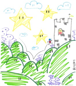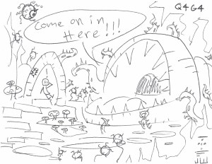 A pastiche of stuff, including a tentacle monster and green flame from the Dark One’s cave, a bug pillar from outside said cave, the Borgov’s castle if it were floating for some reason, and a scary eyeball monster that in reality is just the mouse cursor.