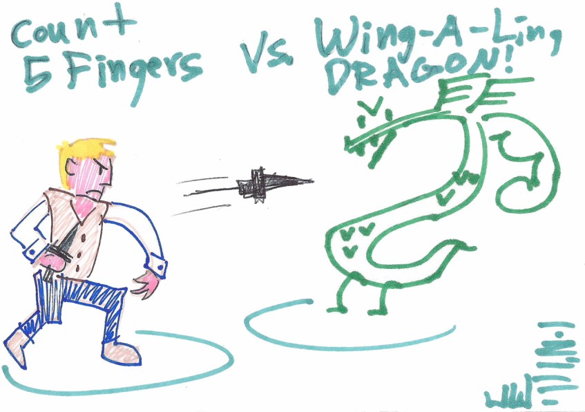 tumblr_ohocu7b6tm1uo33e3o1_1280 Published April 5, 2017 at 1280 × 901 in Quest for Glory 4 Doodles Count Fivefingers vs. a wing-a-ling Trogdor (who nearly appears in the game).