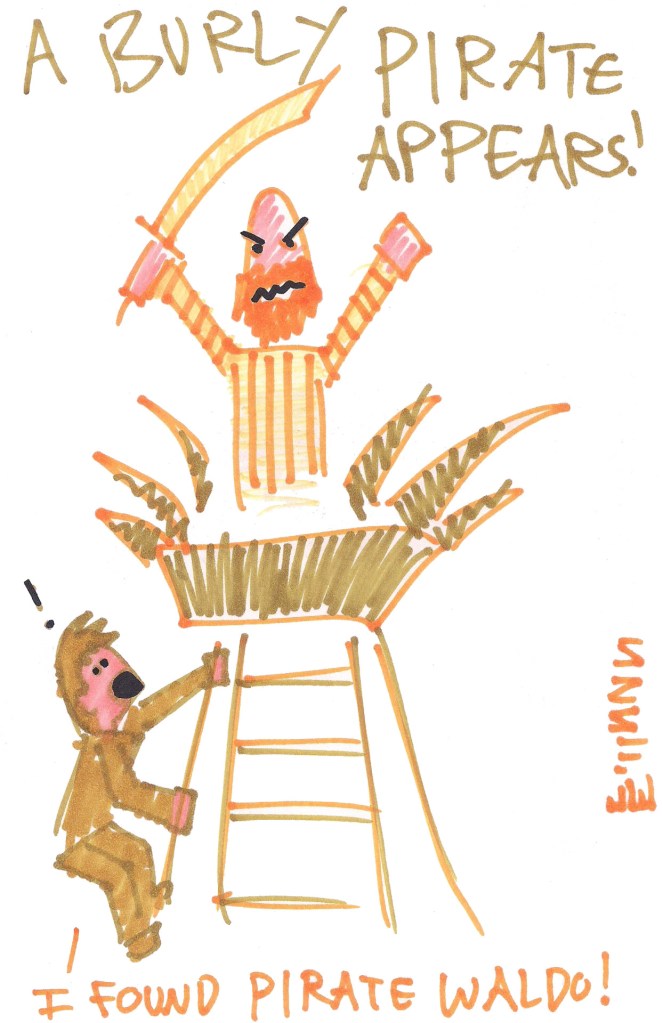 tumblr_o9chctmik71uo33e3o1_1280 Published October 16, 2016 at 1244 × 1920 in King’s Quest III Redux Doodles An update of a drawing done during our original King’s Quest III stream. Gwydion finds Pirate Waldo in the crow’s nest! And he looks like Bert!