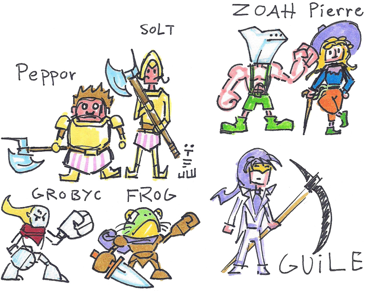 tumblr_oeekpxs9xs1uo33e3o1_1280 Published December 2, 2016 at 1280 × 1017 in Chrono Cross Doodles Some more NPC’s from Chrono Cross (well, except for Frog). ZOAH here actually has more clothes on than he does in the game, if you can believe it.