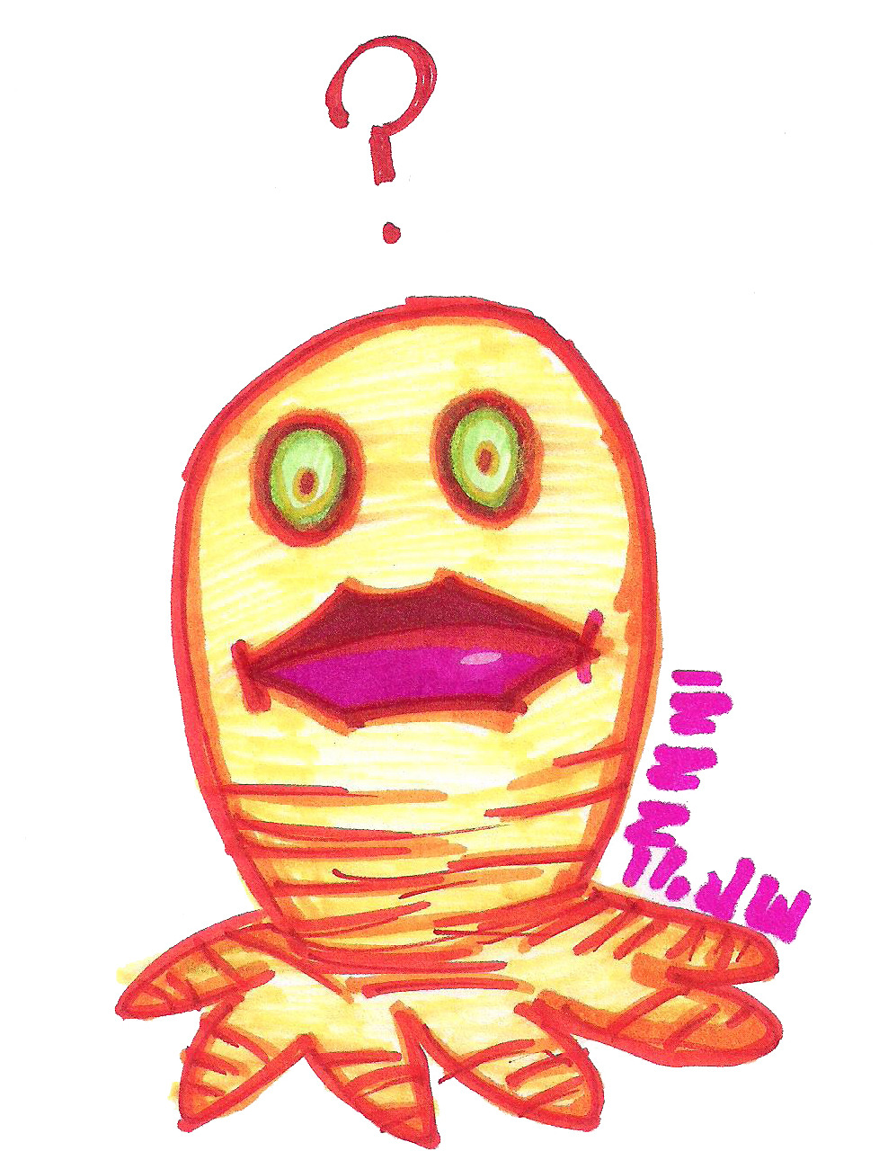 tumblr_omerb6e1mc1uo33e3o1_1280 Published June 26, 2017 at 978 × 1290 in Chrono Cross Doodles One of the googly-eyed monsters from the Shadow Forest. I don’t think it even has a name, as you don’t fight it but feed it to another monster. It seems confused as to its own existence.