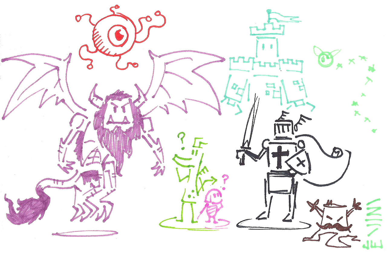 tumblr_p4m7rtztp61uo33e3o1_1280 Published March 8, 2018 at 1280 × 837 in Dokapon Kingdom Doodles A beholder, an archdemon, a square castle golem, a knight (actually from Dokapon Journey), a grumbly old Treant, and a fairy, prepare to harass Zoe and Beans (from the Doodler’s comic strip).
