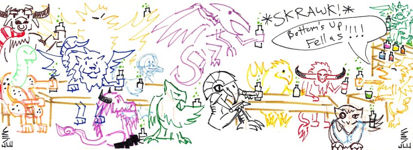 tumblr_p4maj7yfwa1uo33e3o1_1280 Published March 8, 2018 at 1280 × 466 in Dokapon Kingdom Doodles The drunk griffin bartender at what looks like the Last Supper but with flying creatures! Can YOU name all these characters from Player and Doodler streams?