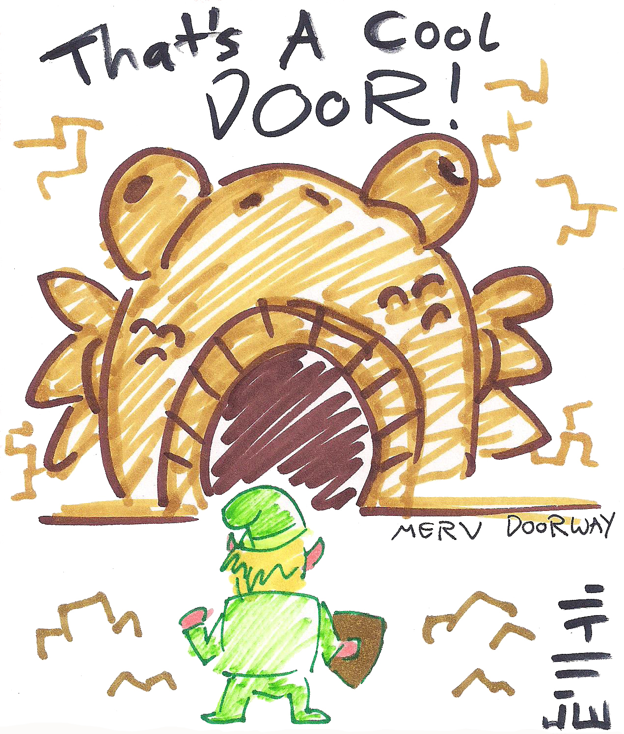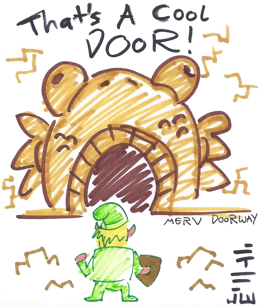 tumblr_oeeo6hlobl1uo33e3o1_1280 Published January 30, 2017 at 1271 × 1494 in Link’s Awakening DX Doodles Why if it isn’t our old friend Merv Doorway, the coolest dungeon door there is! Based on the entrance to Angler’s Tunnel.