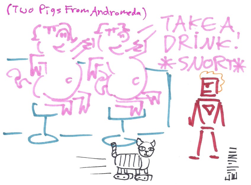 tumblr_okxcik3ont1uo33e3o1_1280 Published June 1, 2017 at 1280 × 944 in Space Quest 6 Doodles Two pigs from Andromeda tell Roger to take a drink while a cat on wheels zooms by!
