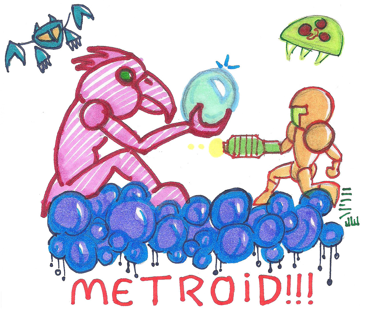 tumblr_opo22izuht1uo33e3o1_1280 Published August 25, 2017 at 1280 × 1087 A nice pastiche, with a Geruta, a chozo statue, Samus, and a Metroid.